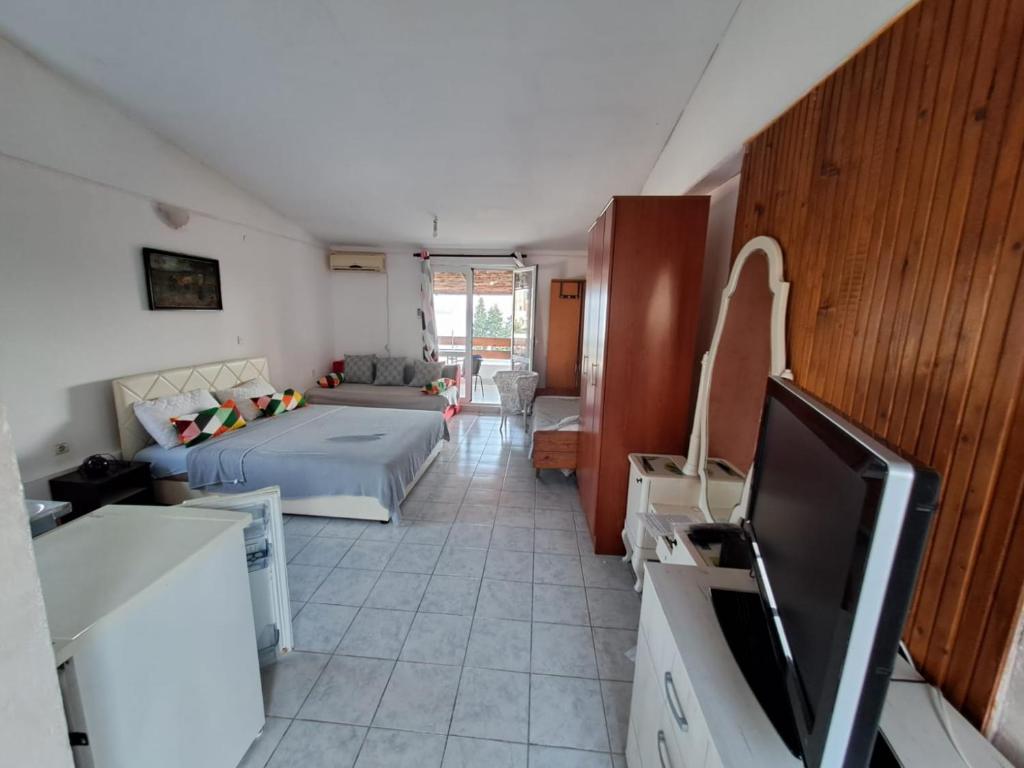The triple room's kitchenette, which features a refrigerator and kitchenware, is available for cooking and storing food. The triple room offers air conditioning, a tea and coffee maker, a terrace with sea views as well as a shared bathroom featuring a hairdryer. The unit offers 2 beds.