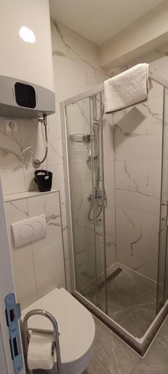 tuš, fen za kosu, toalet, peškiri, toalet papir, tuš bez praga, šampon, sapun za telo, dodatni toalet