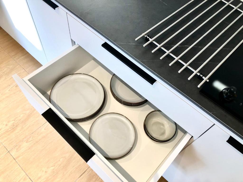 frižider, mikrotalasna rerna, mašina za pranje sudova, mašina za pranje veša, kuhinja, električno kuvalo, posuđe, rerna, ploča za kuvanje, toster, aparat za kafu, sto za ručavanje, dečja visoka stolica, čaše za vino